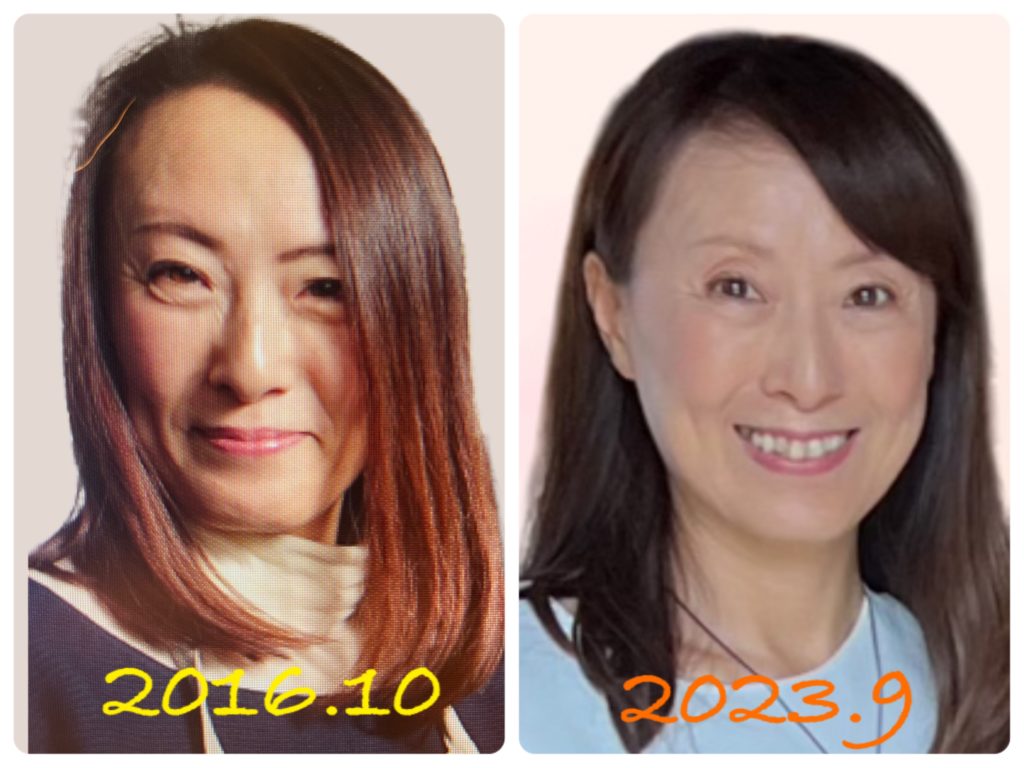 これでもわたしとしては笑顔のつもりだったのです。笑顔なのに口角が下がっていますね。そして鼻の横、目尻、口周りがシワがたくさん!!瞼も下がって黒目に半分くらいかぶっています。優しい、女性らしい笑顔からは程遠い~~~~。このまま時を進めていたらどんなことになっていたかと思うと怖くなります。この時から7年半近く経ちます。コツコツOKAOキントレのレッスンをし、OKAOキントレインストラクターの資格も取り指導する立場になり、今では咄嗟に写真を撮られても、キュッと口角20度鋭角の笑顔ができるようになりました。